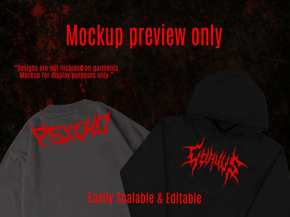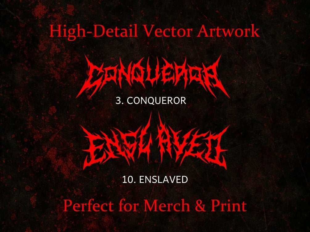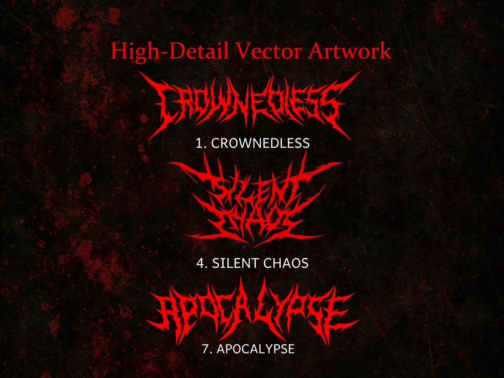 Each design combines metal typography, abstract glyphs, and occult-inspired strokes to create a striking, unique visual impact.