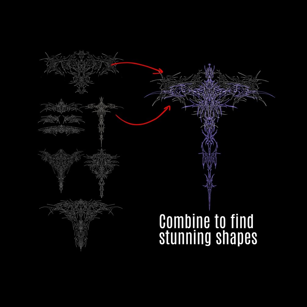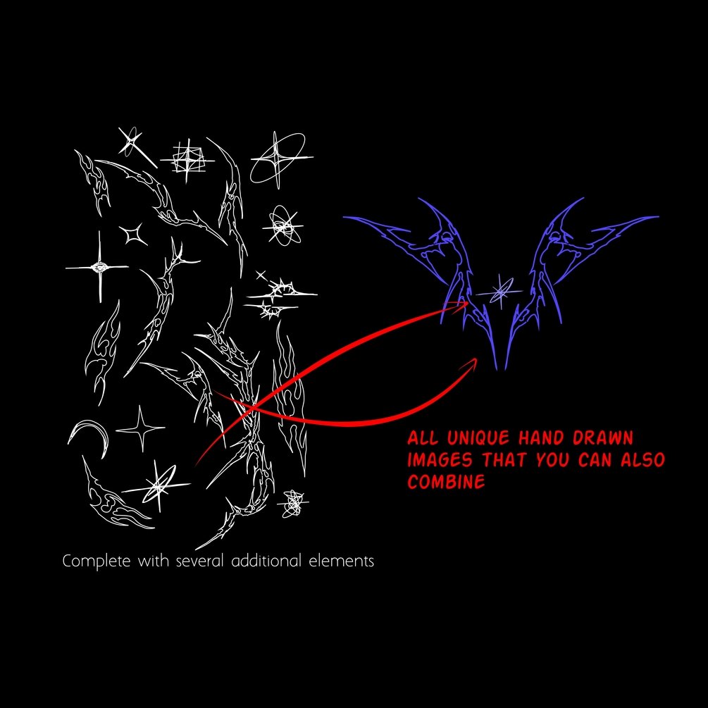 Unleash your creativity with this Neo-Tribal Abstract Elements Pack! Featuring meticulously hand-drawn elements, this collection is designed for ultimate flexibility, allowing you to craft unique compositions by mixing and matching different pieces. Whether you're working on tattoo designs, apparel prints, album covers, posters, futuristic branding, or digital artwork, this pack is made to elevate your creative projects.
